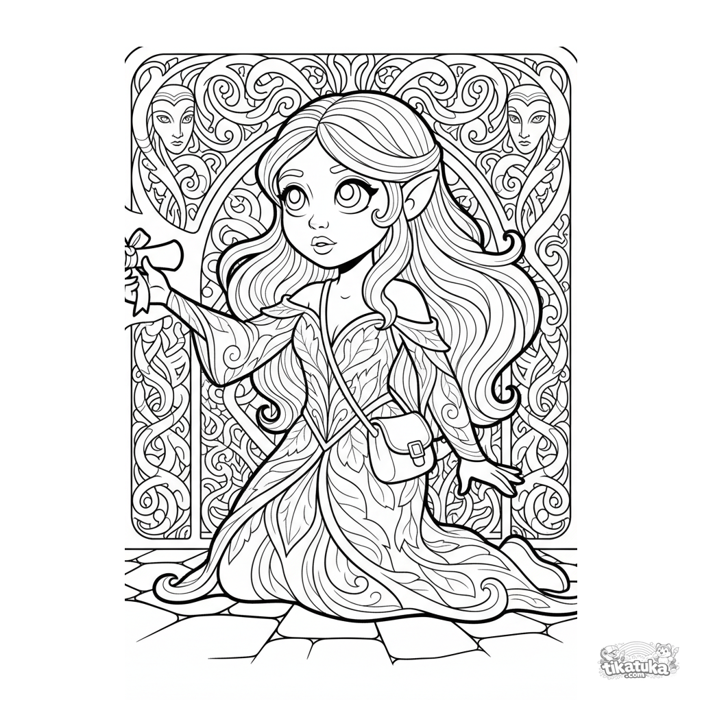 Ausmalbild für Kinder 7-9: Eine Waldnymphe in der Gorgonenhöhle überbringt eine dringende Schriftrolle. Eine Szene mit Details für ansprechendes Ausmalen.