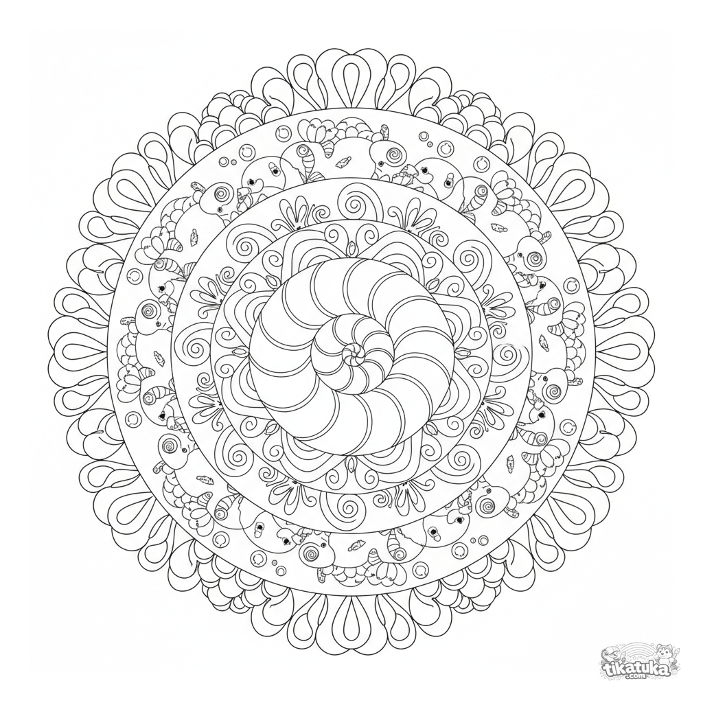 Detaillierte Ozean-Mandala zum Ausmalen für 10-12 Jährige. Nautilus-Spirale in der Mitte, Wellenringe, Seepferdchen, Fischschuppen, sechsfache Symmetrie.