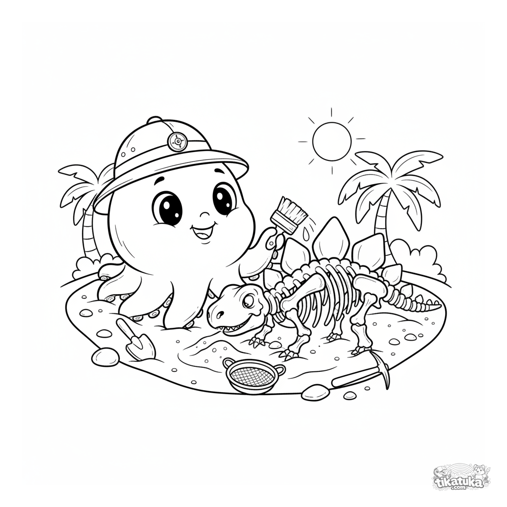 Ausmalbild für Kinder 4-6: Ein süßer Oktopus-Archäologe wischt Sand von einem Dinosaurierfossil. Einfache Linien, skandinavischer Spielzeugstil.