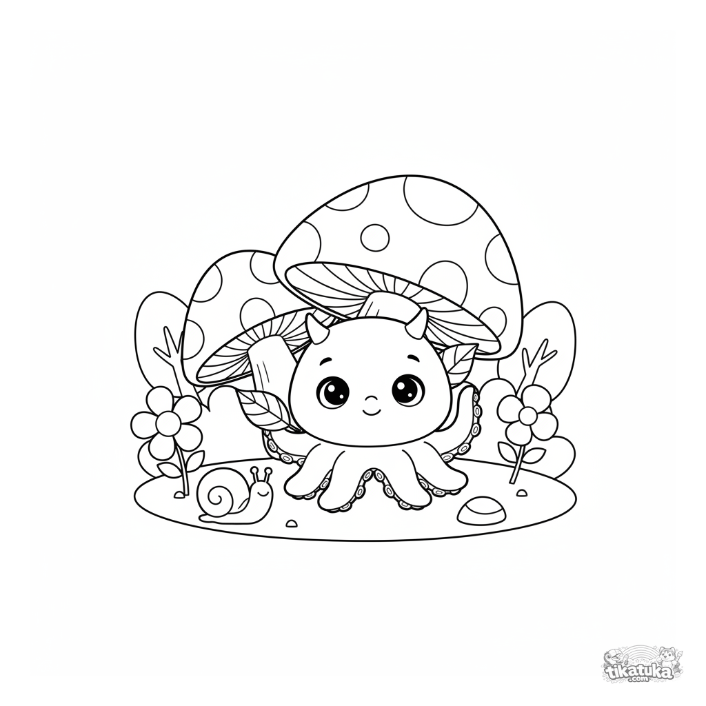 Ausmalbild für Kinder 4-6: Oktopus Bublik als freundliches Waldmonster lugt hinter einem Pilz hervor. Weicher Puppenstil, gemütliche Walddetails.