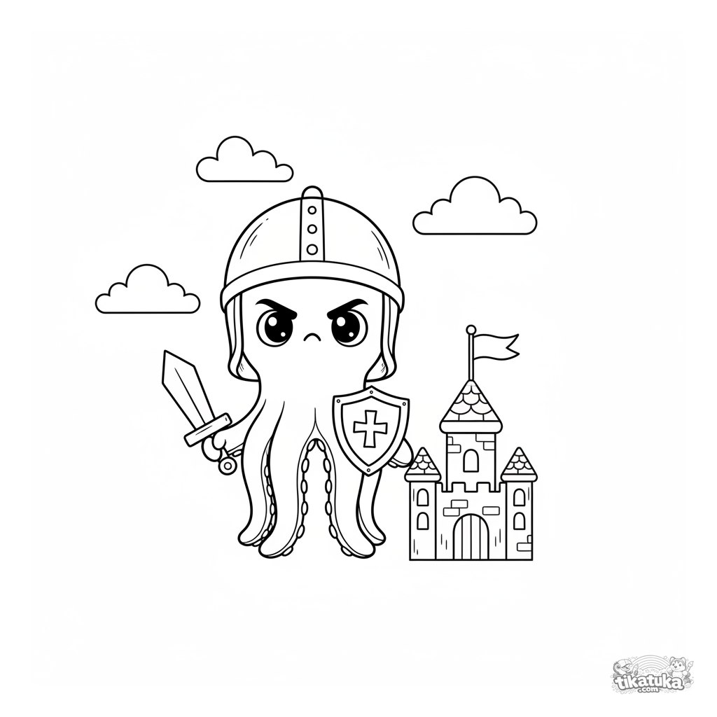 Ausmalbild für Kinder 4-6: Oktopus Bublik als tapferer Ritter bewacht eine Spielzeugburg. Geometrische Formen, Holzspielzeug-Stil.