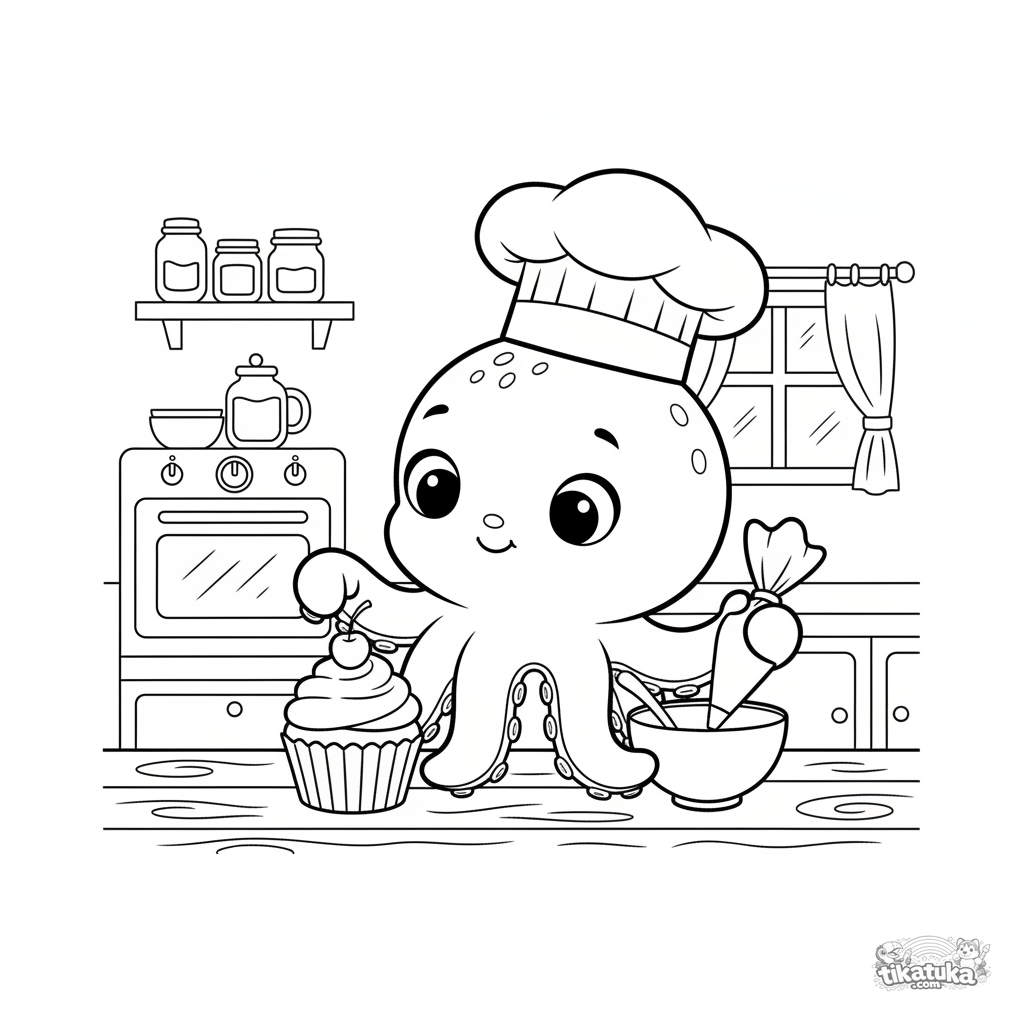 Kinder-Ausmalbild: Oktopus Bublik mit Kochmütze verziert einen Cupcake. Niedliche Küchenszene mit einfachen Umrissen und breiten Rändern.
