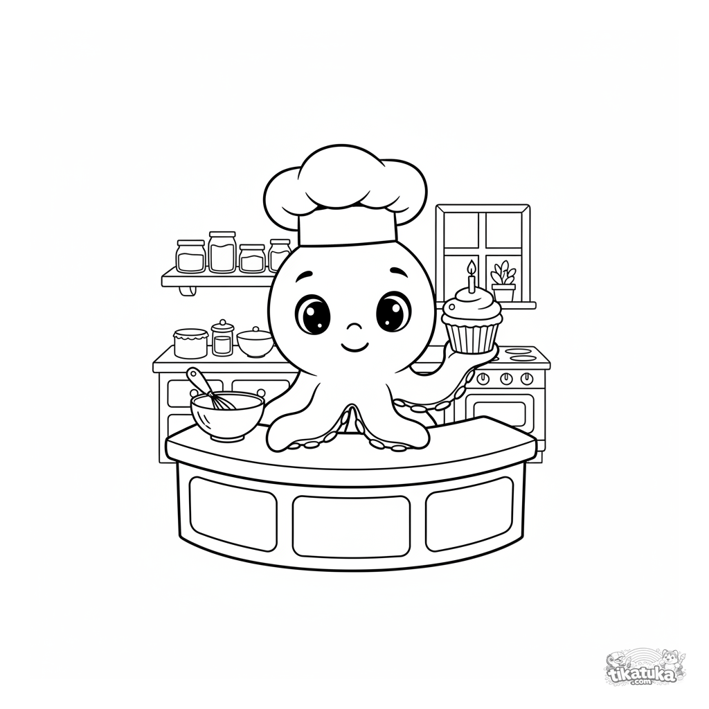 Ausmalbild für Kinder: Oktopus Bublik mit Kochmütze backt einen Cupcake in einer gemütlichen Küche. Niedliche Details, einfache Formen.