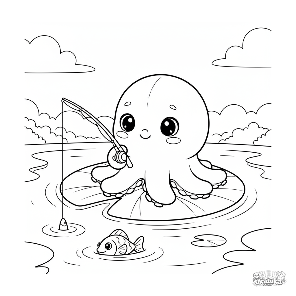 Ausmalbild für Kinder 4-6: Oktopus Bublik sitzt auf einem Seerosenblatt-Boot und angelt. Friedliche Szene, Plüschmaskottchen-Stil.