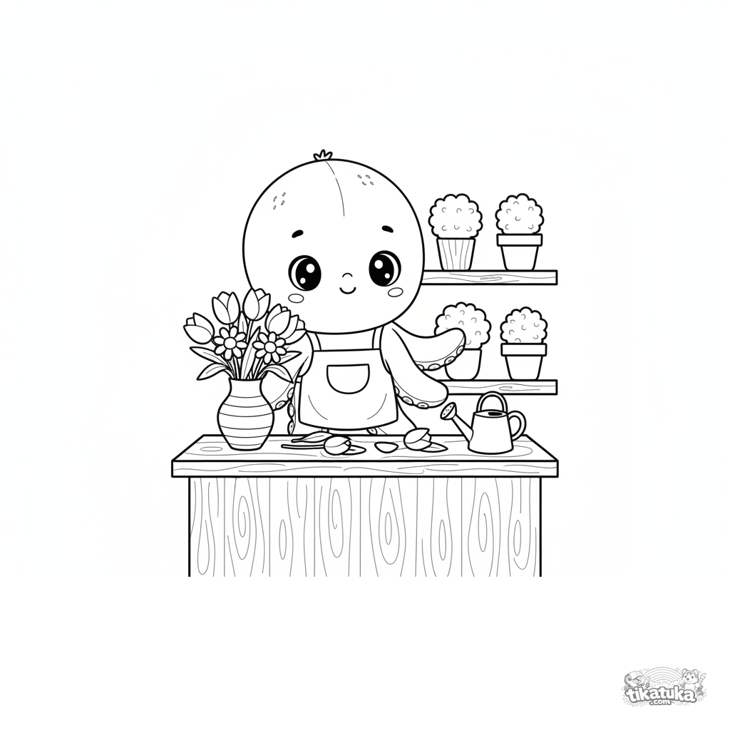 Kinder-Ausmalbild: Ein Oktopus-Florist arrangiert einen Strauß in seinem gemütlichen Laden. Plüschtier-Stil, einfache Formen.