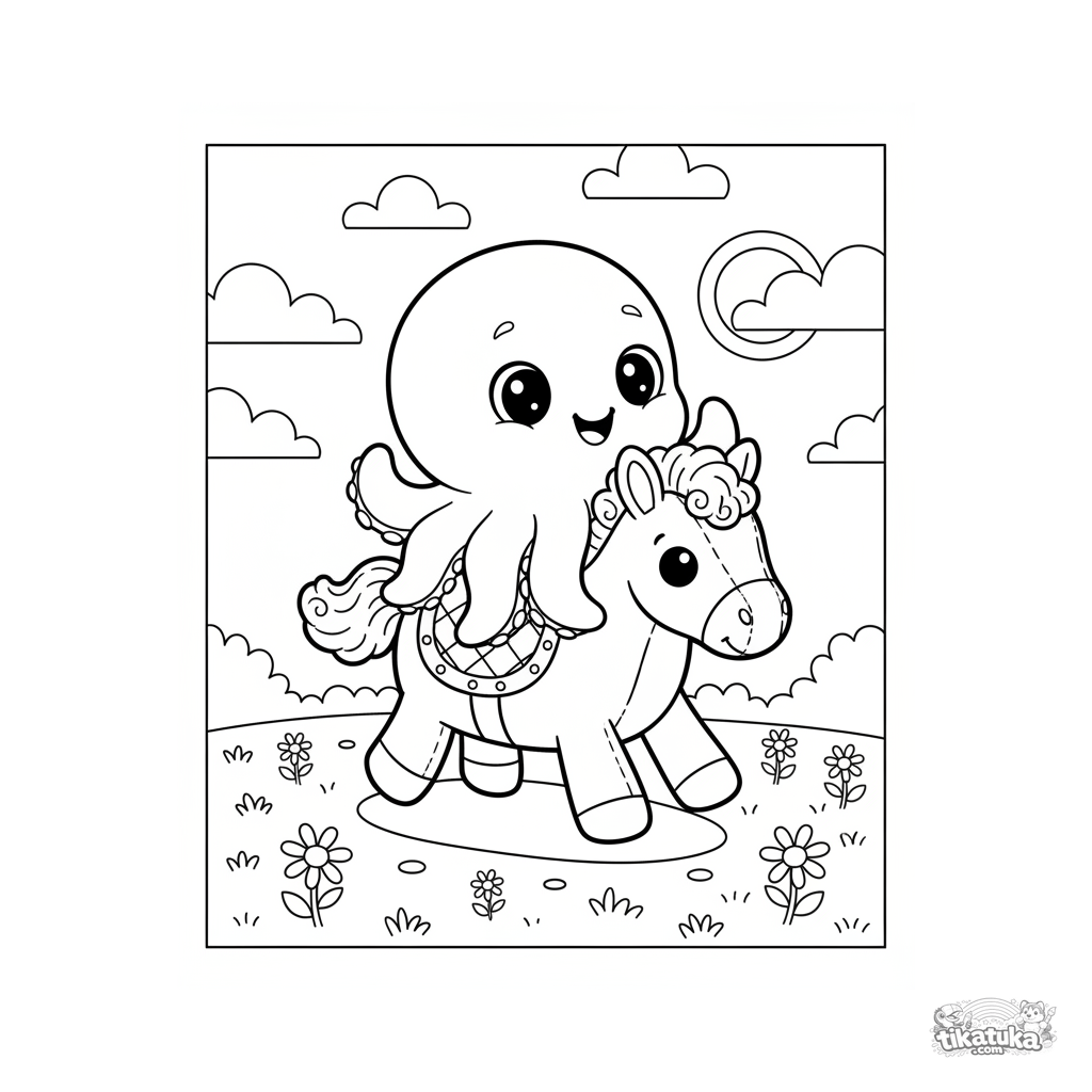 Ausmalbild für Kinder: niedlicher Oktopus Bublik reitet ein Spielzeugpony auf einer Wiese. Einfache Linien, breite Ränder, geeignet für 4-6 Jahre.