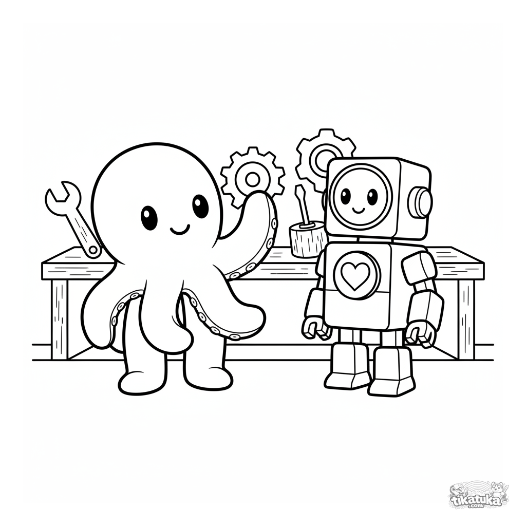 Ausmalbild für Jungen: Oktopus Bublik trifft einen freundlichen Roboter in einer Werkstatt. Klare Umrisse, skandinavischer Spielzeugstil, für 4-6 Jahre.