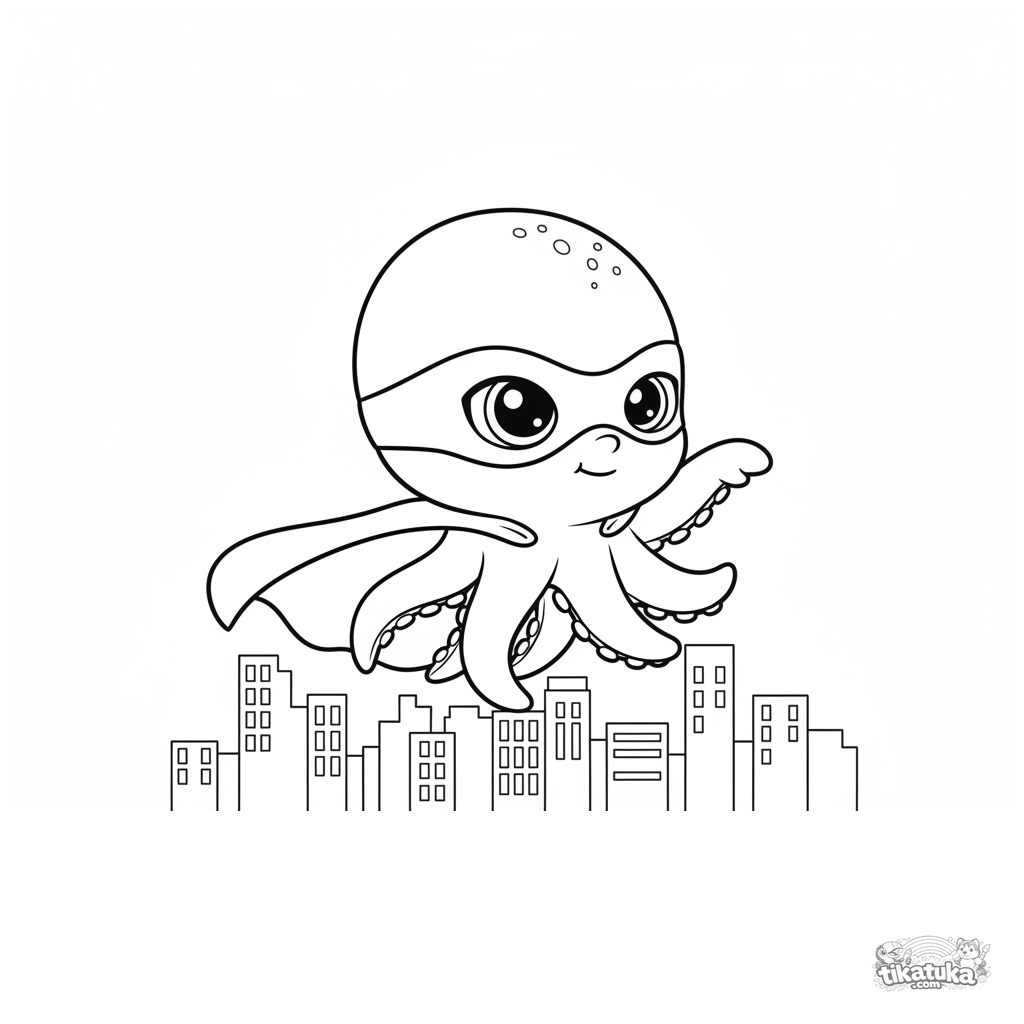 Ausmalbild für Kinder 4-6: Oktopus Bublik mit Superheldenumhang fliegt über der Stadt. Dynamische Pose, einfache Skyline-Silhouette.