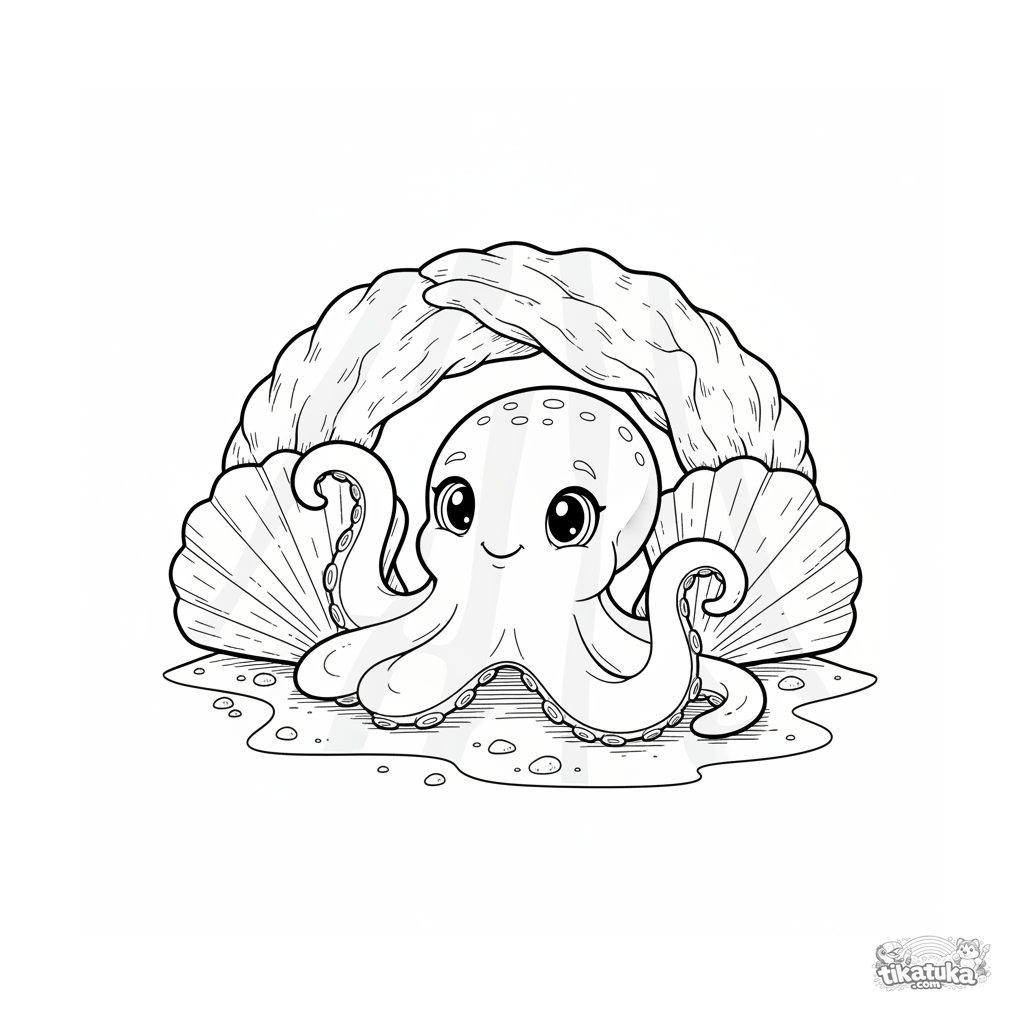 Ausmalbild eines klugen Oktopus, der unter einer Muschelarkade im sonnenbeschienenen Flachwasser hervorlugt.