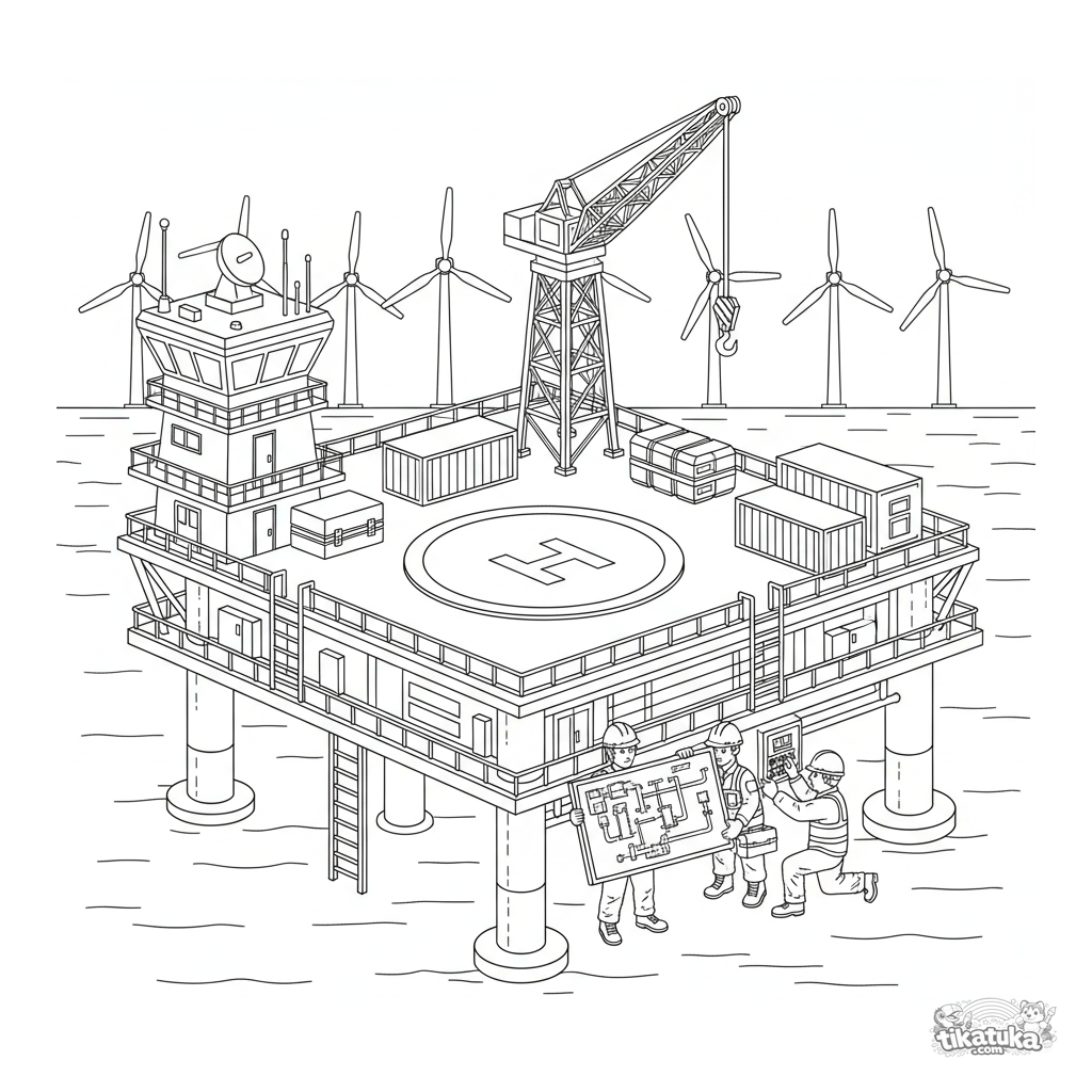 Ausmalbild für 10-12 Jahre: eine detaillierte Wartungsplattform für Offshore-Windräder, mit Helipad, Kran und Technikern in Schutzhelmen.