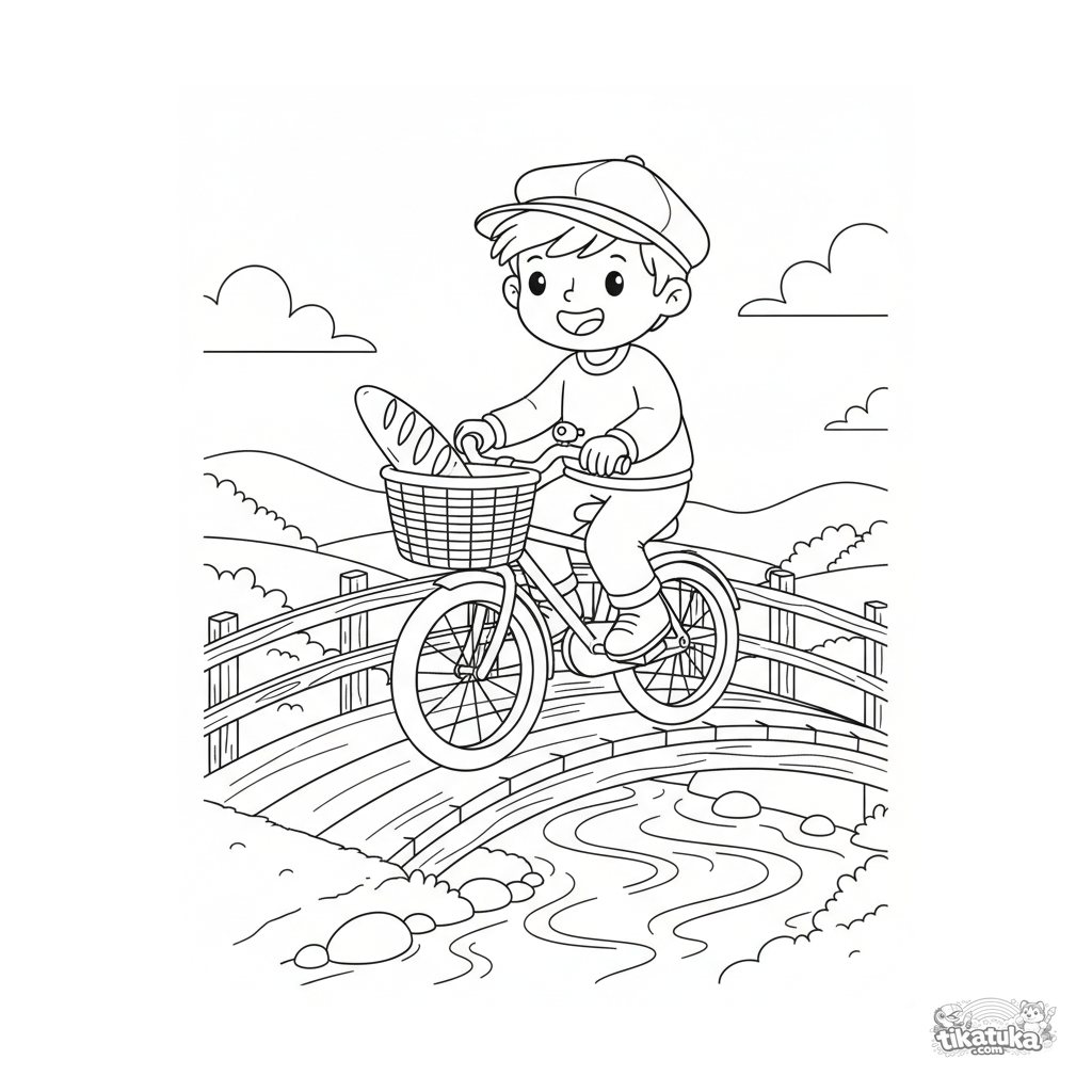 Ausmalbild für Jungen 4-6: Ein niedliches Vintage-Fahrrad mit Korb wird über eine Holzbrücke über einem Fluss gefahren.