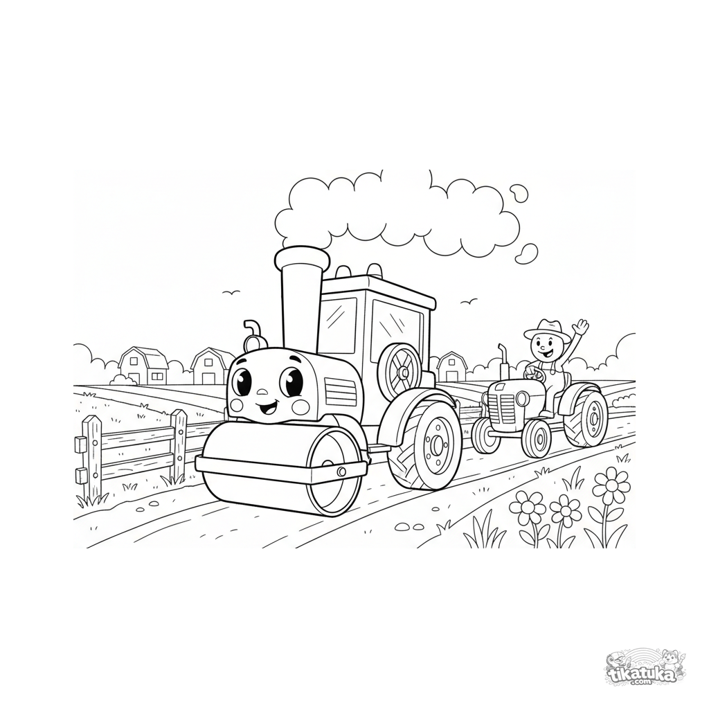 Ausmalbild für Jungen: eine alte Dampfwalze fährt eine Landstraße entlang. Dampfwolken, ein Bauer winkt vom Feld.