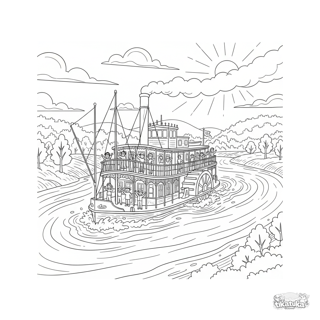 Ausmalbild für Kinder von 4-6 Jahren: Ein alter Raddampfer fährt bei Sonnenuntergang einen Fluss hinab. Passagiere winken vom Deck, das große Schaufelrad dreht sich.