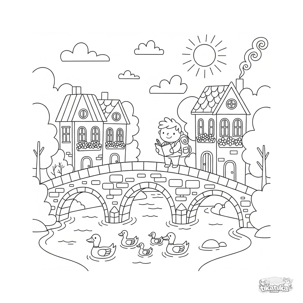 Ausmalbild für Kinder: eine alte Steinbrücke über einen Fluss mit Enten und einem zeichnenden Reisenden. Eine gemütliche Stadtszene im Volksstil.