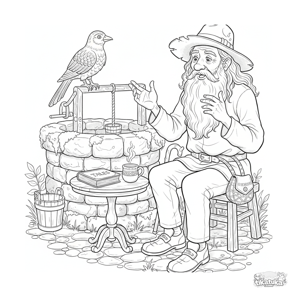 Detailliertes Ausmalbild für Kinder 10-12: Ein weiser alter Geschichtenerzähler teilt eine Geschichte am Brunnen des lebendigen Wassers. Szene im Aquarell-Skizzenstil mit Buch und Tasse.