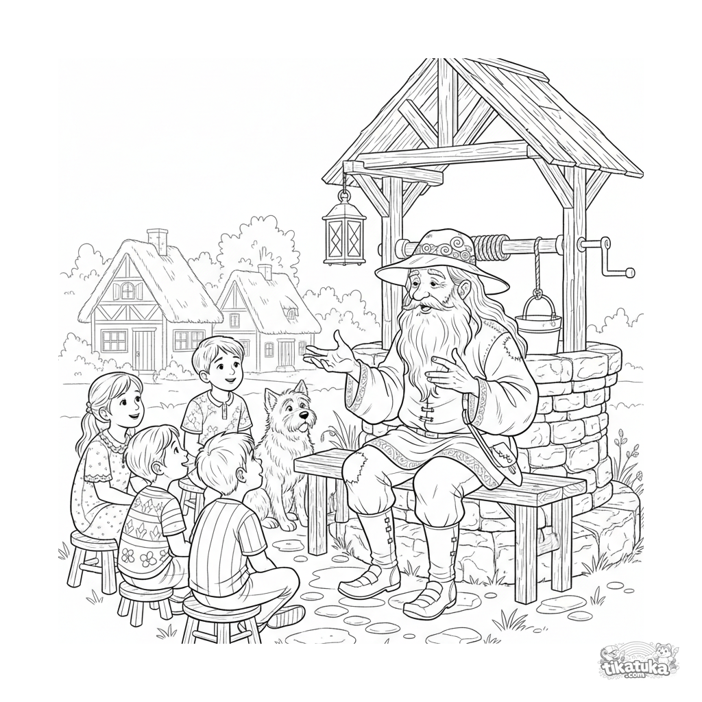 Ausmalbild für ältere Kinder 10-12: Ein alter Geschichtenerzähler berichtet eine Geschichte über lebendiges Wasser am Dorfbrunnen. Detaillierte Szene im Stil eines alten Stichs mit Kindern und einem Hund.