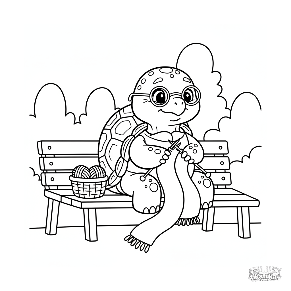 Ausmalbild für Kleinkinder 2-3: Eine große freundliche Schildkröte strickt einen Schal auf einer Parkbank. Einfache Formen, breite Ränder zum Ausmalen.