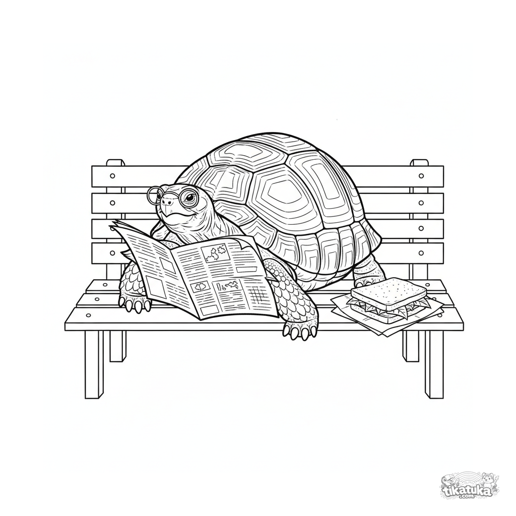 Ausmalbild für ältere Kinder 10-12: eine detaillierte Schildkröte, die auf einer Bank mit einer Zeitung schlummert. Realistischer Stil.