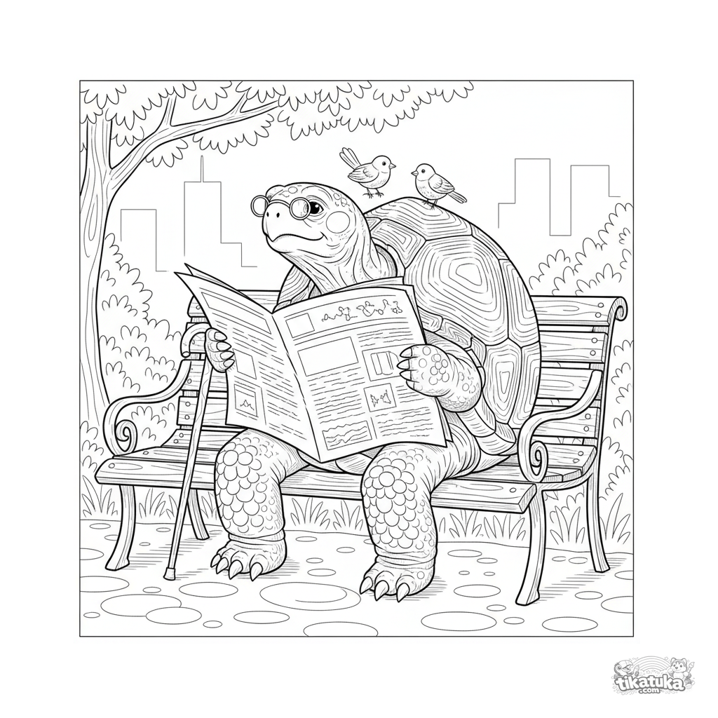 Komplexes Ausmalbild für Kinder 10-12: Eine weise Schildkröte mit Brille liest Zeitung auf einer Parkbank. Vintage-Stich-Stil.