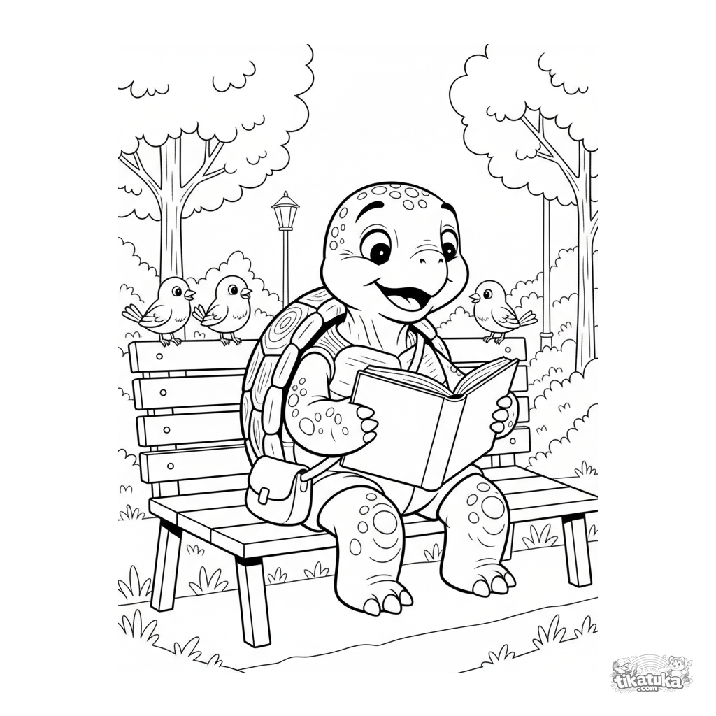 Ausmalbild für Kinder 7-9: Eine weise Schildkröte liest ein Geschichtenbuch auf einer Parkbank, kleine Vögel hören zu.
