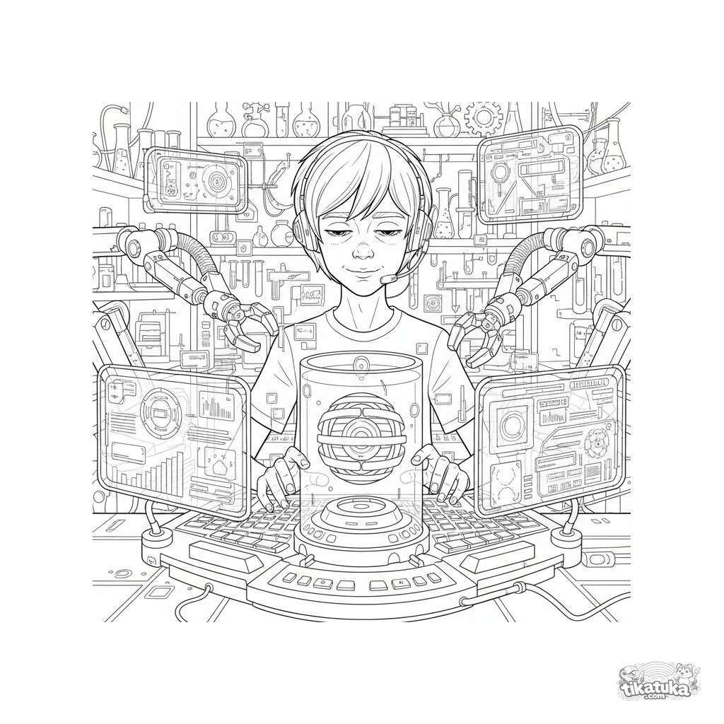 Ausmalbild für ältere Kinder 10-12: Ein Erfinderlehrling programmiert einen KI-Kern an einer holographischen Konsole in einem geheimen Hightech-Labor.