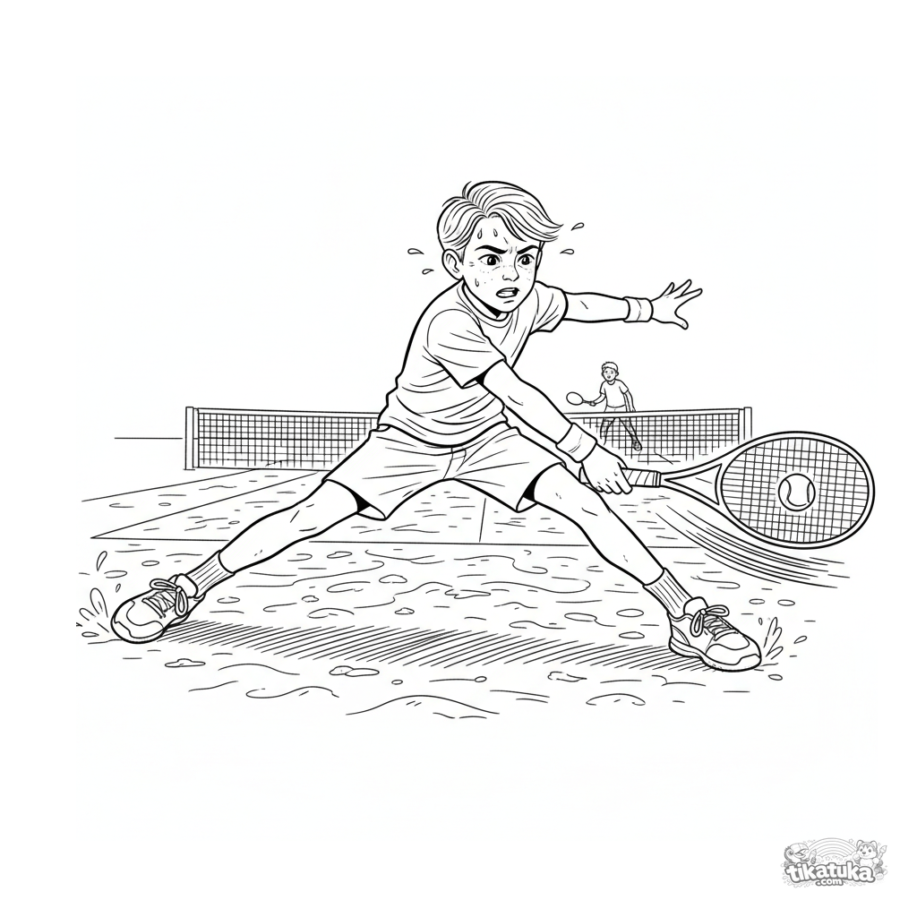 Ausmalbild für ältere Kinder 10-12 Jahre: detaillierte Szene eines intensiven Tennisballwechsels auf einem Sandplatz. Dynamische Pose, detaillierte Ausrüstung und Texturen.