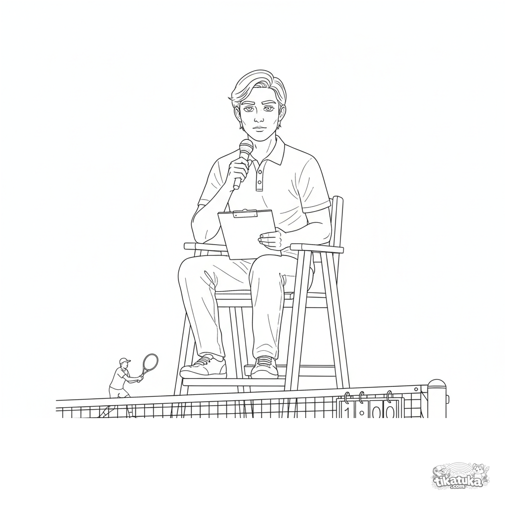Detailliertes Ausmalbild für ältere Kinder 10-12 Jahre: ein Schiedsrichter beobachtet das Match vom hohen Stuhl auf einem Tennisplatz. Realistische Proportionen, Uniformelemente, Perspektive.