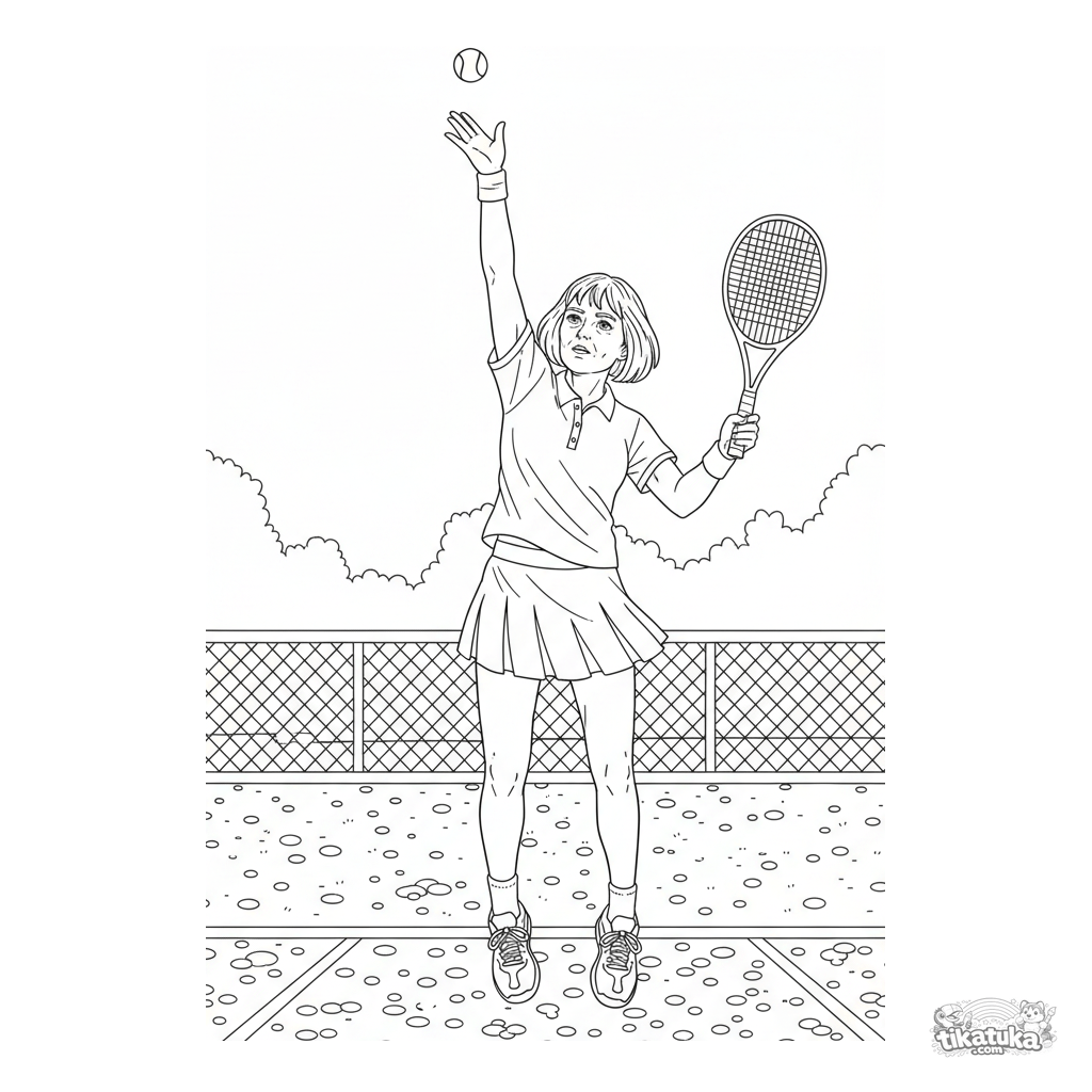 Ausmalbild für ältere Kinder 10-12 Jahre: eine detaillierte Darstellung eines Tennisspielers beim Aufschlag. Realistische Umrisse und anatomische Details.