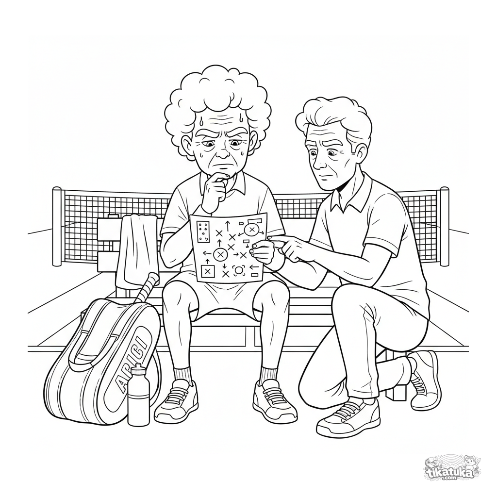 Ausmalbild für ältere Kinder 10-12 Jahre: detaillierte Szene einer Tennis-Auszeit. Spieler und Trainer besprechen Strategie, detaillierte Emotionen, Ausrüstung und Accessoires.