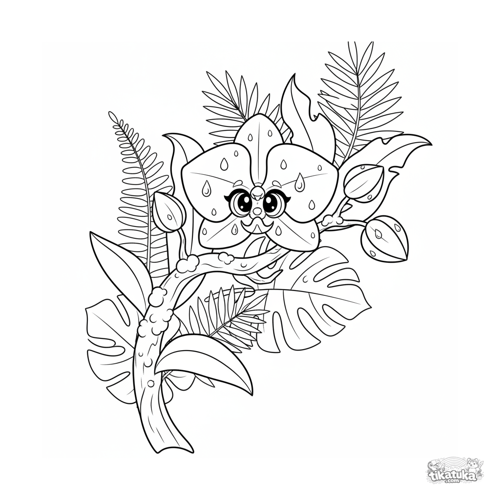 Ausmalbild für Tweens: Eine zarte Orchideenknospe öffnet sich auf einem moosigen Ast im Regenwald. Art-Nouveau-lite-Stil, mäßiges Detail.