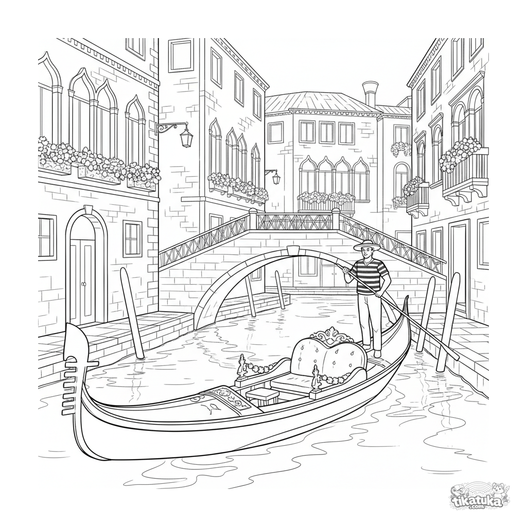 Ausmalbild für Kinder von 7-9 Jahren: eine detaillierte venezianische Gondel unter einer Steinbogenbrücke. Szene mit architektonischen Details.