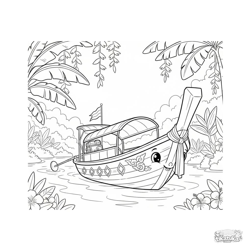Detailliertes Ausmalbild für ältere Kinder 10-12: Ein kunstvoll geschnitztes und bemaltes thailändisches Longtail-Boot fährt auf einem Dschungelfluss. Viele Muster, Schnitzereien und tropisches Laub.