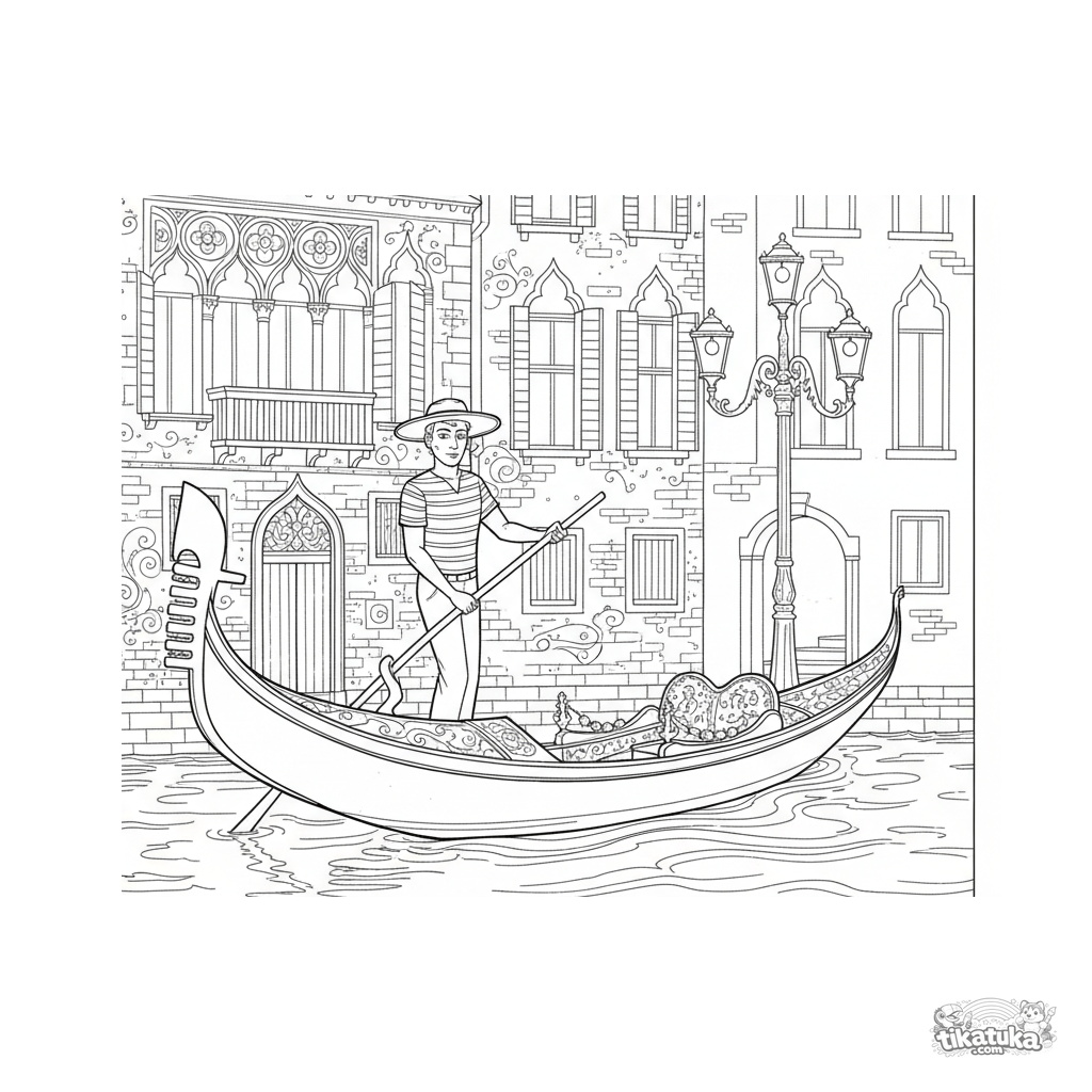 Detailliertes Ausmalbild für ältere Kinder 10-12: Eine aufwendige venezianische Gondel gleitet bei Sonnenuntergang einen Kanal entlang. Wasserspiegelungen, Architektur und Stimmung erfordern beim Ausmalen Liebe zum Detail.