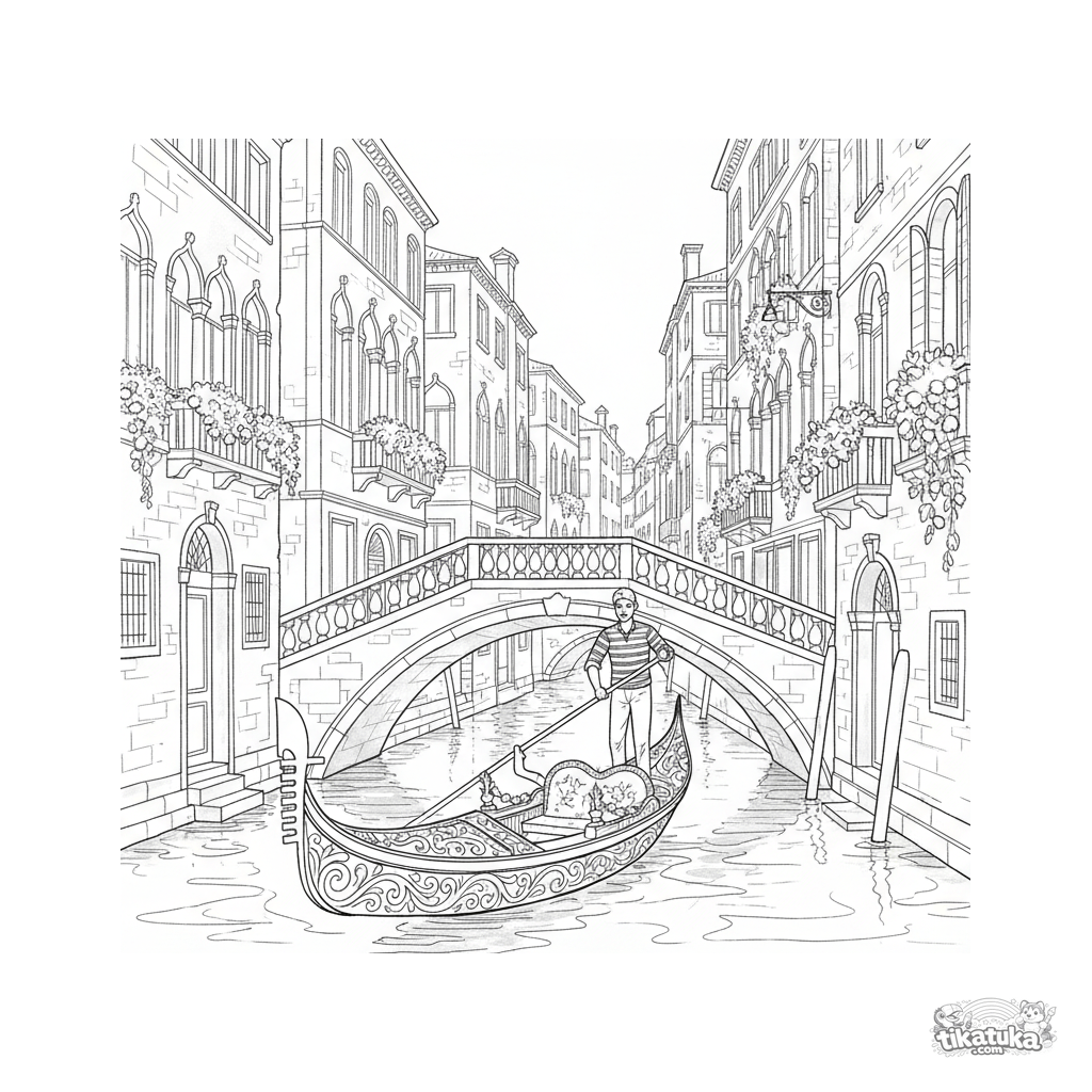 Detailliertes Ausmalbild für ältere Kinder 10-12: Eine verzierte venezianische Gondel gleitet unter einer Steinbrücke auf einem Kanal. Gebäude mit Blumenkästen, ein Gondoliere. Elegante Szene.