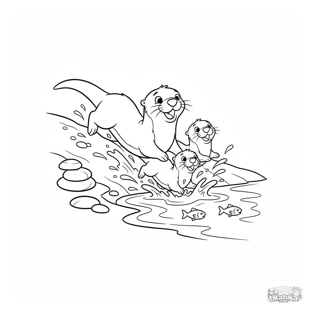 Ausmalbild für Kinder 7-9: Eine verspielte Otterfamilie rutscht ein matschiges Ufer in einen klaren Bach hinab. Dynamische Posen, Wasserspritzer, ausdrucksstarke Gesichter.
