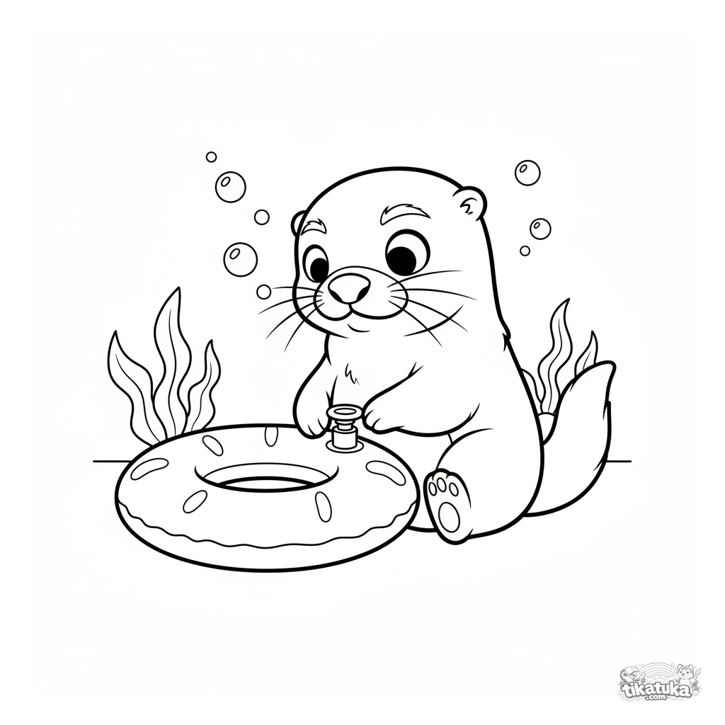 Ausmalbild für Kinder 4-6: Ein verspieltes Otterjunges sitzt auf dem Beckenboden und untersucht neugierig das Ventil eines Schwimmrings.