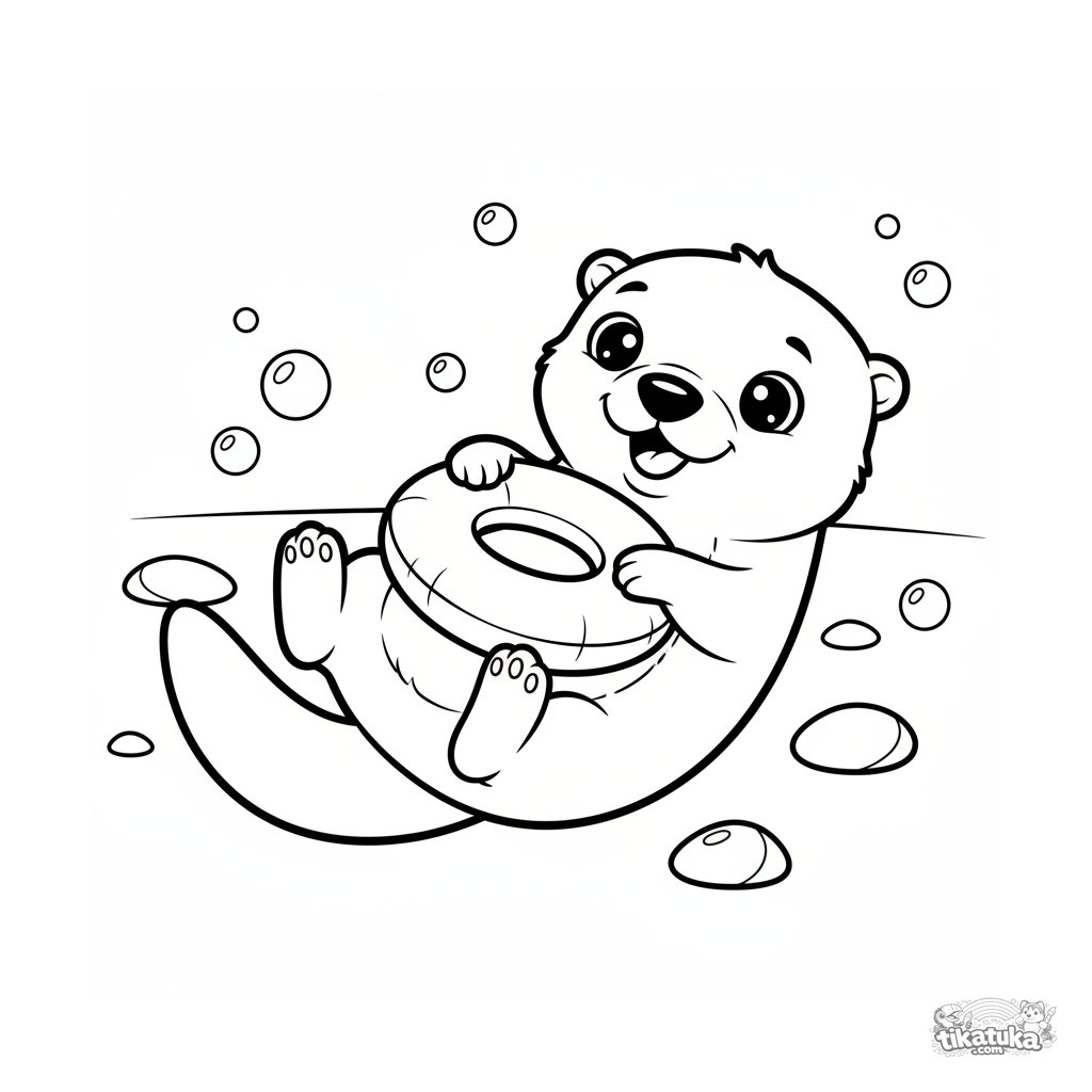Ausmalbild für Kinder 4-6: Ein verspieltes Otter-Junges liegt auf dem Rücken am Poolboden und balanciert einen Schwimmring auf dem Bauch. Szenenbild im Storybook-Stil.
