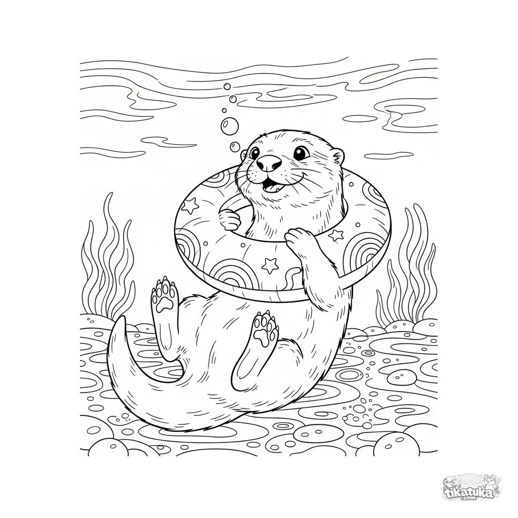 Detailliertes Ausmalbild für ältere Kinder 10-12: Ein verspieltes Otter-Junges liegt am Poolboden und hält einen Schwimmring darüber. Realistische Proportionen, ausdrucksstarke Pose.