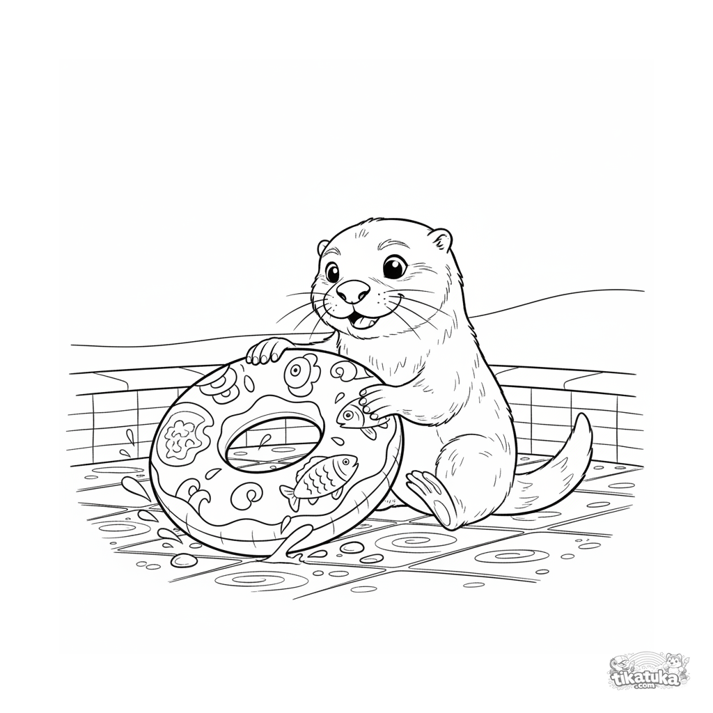 Detailliertes Ausmalbild für Kinder von 10-12 Jahren: Ein verspielter Otter rollt einen Schwimmring am Poolboden. Szene mit Textur, Bewegung und Ausdruck.