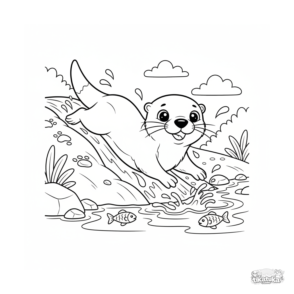Ausmalbild für Kinder 7-9: Ein verspielter Otter rutscht einen schlammigen Hang in einen klaren Bach hinunter. Eine dynamische und lustige Tieraktionsszene zum Ausmalen.