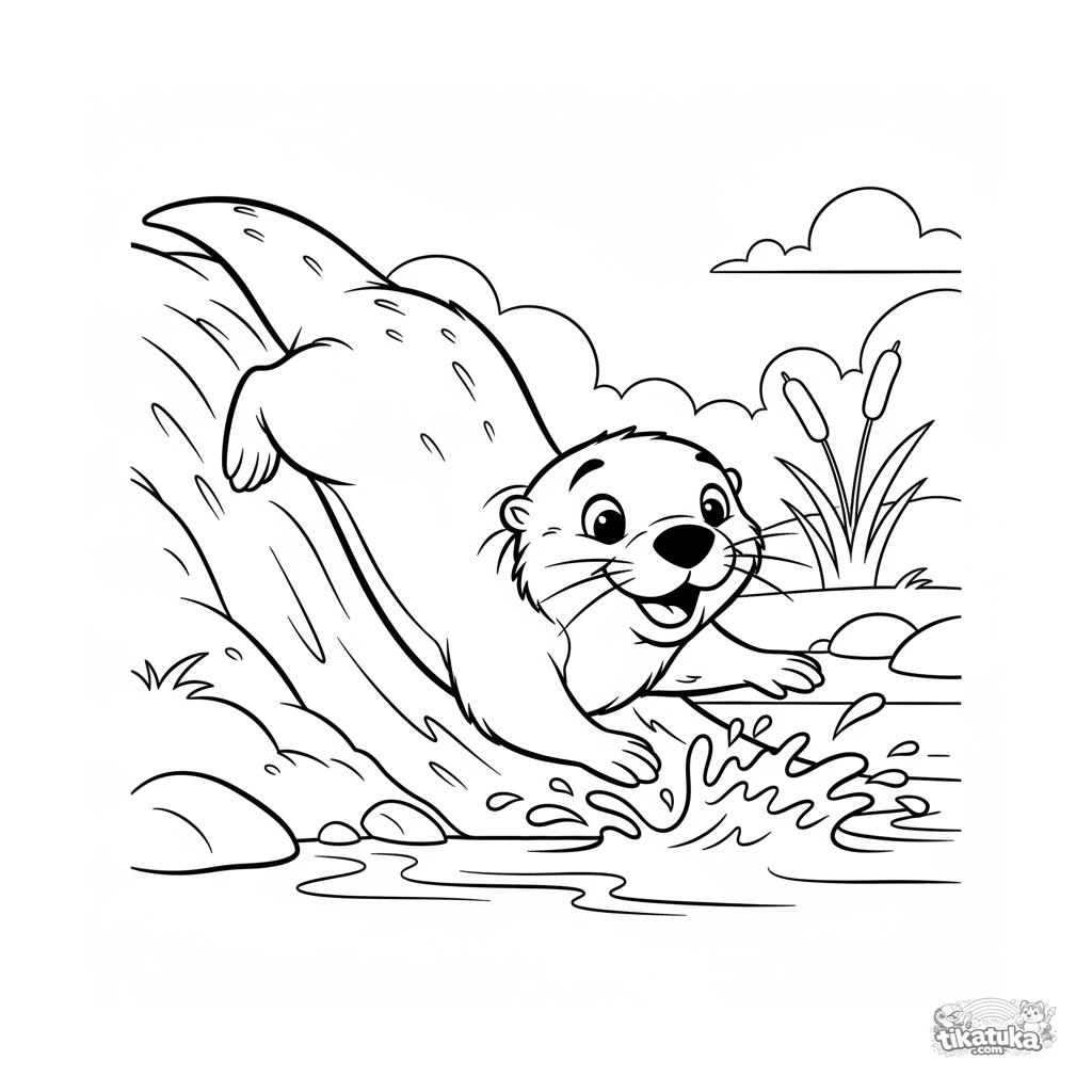 Ausmalbild für Kinder 4-6: ein glücklicher Otter rutscht das Ufer hinab in einen Bach. Dynamische und niedliche Szene.