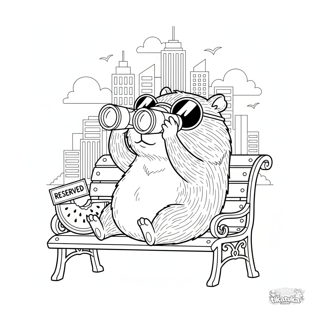 Ausmalbild für Kinder 10-12: Ein überzeugtes Capybara mit Sonnenbrille liegt auf einer Parkbank und schaut mit einem Fernglas auf Wolkenkratzer. Lustige, detaillierte Meme-Szene.