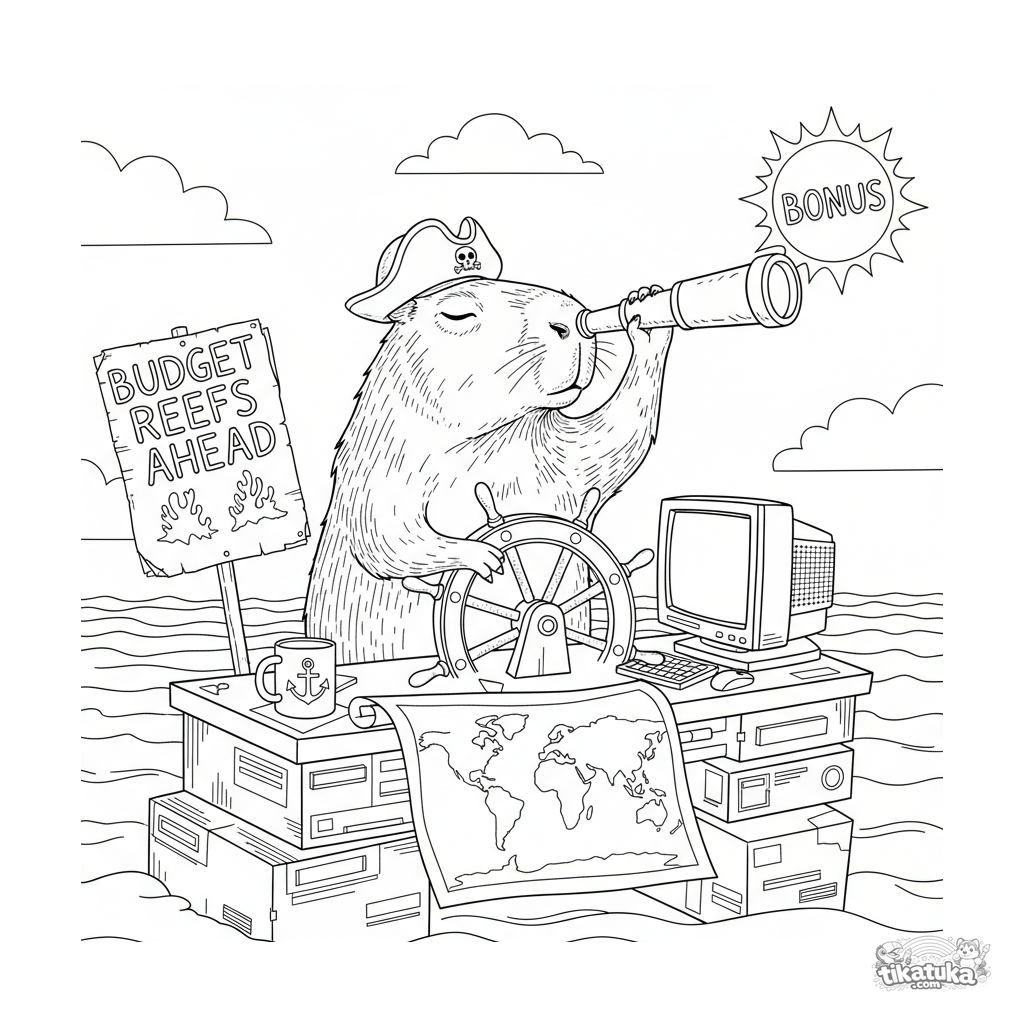 Komplexes Ausmalbild für Kinder 10-12: Eine überzeugte Capybara mit Piratenhut sucht mit einem Teleskop nach einer Prämie am Steuerrad eines Schreibtisch-Schiffs. Detailliertes lustiges Meme.