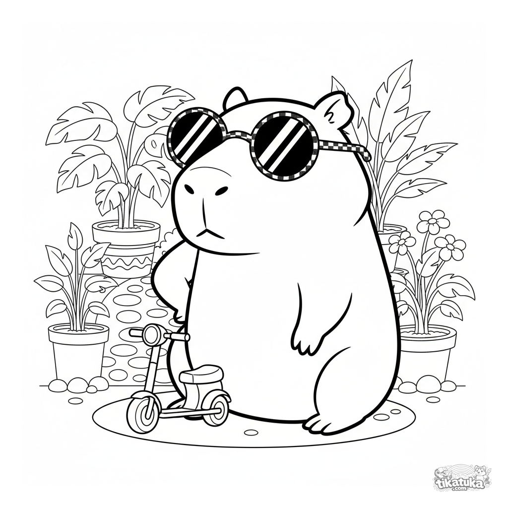 Ausmalbild für Kinder 7-12: Ein riesiges, übermütiges Capybara mit Sonnenbrille posiert stolz neben einem winzigen Scooter. Absurde und lustige Szene im Internet-Meme-Stil.