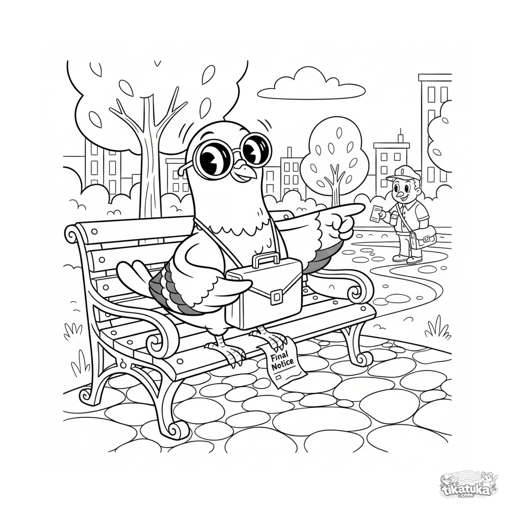 Ausmalbild für Kinder 10-12: Eine überzeugte Taube mit Sonnenbrille benutzt ein Fernglas, um einen Postboten mit Gehaltsscheck von einer Parkbank aus zu verfolgen.