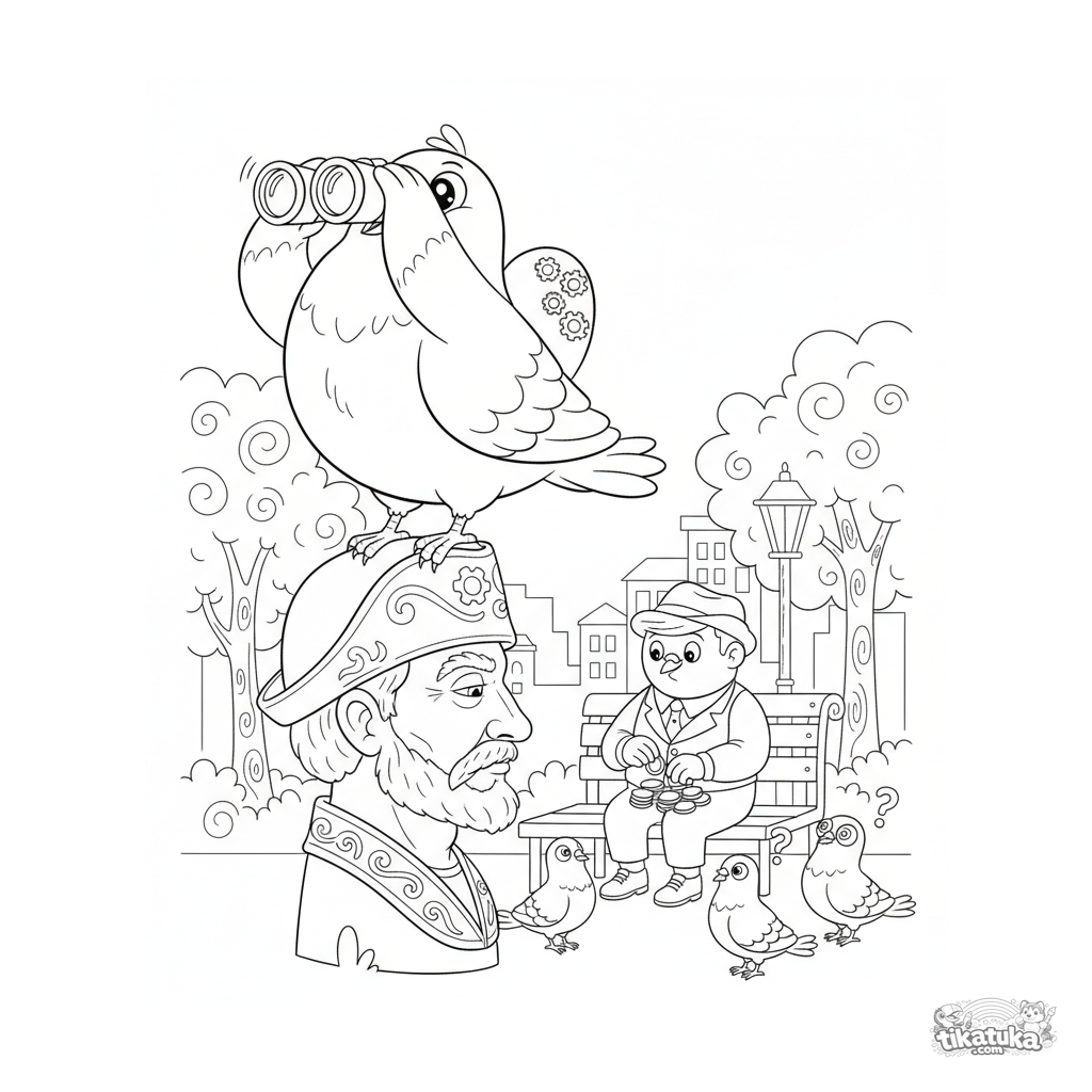 Ausmalbild für Kinder: Eine überhebliche, pummelige Taube mit Fernglas auf einem Park-Statuenkopf, die auf eine Person herabblickt, die Münzen zählt. Chaotische lustige Szene im Retro-Cartoon-Stil.