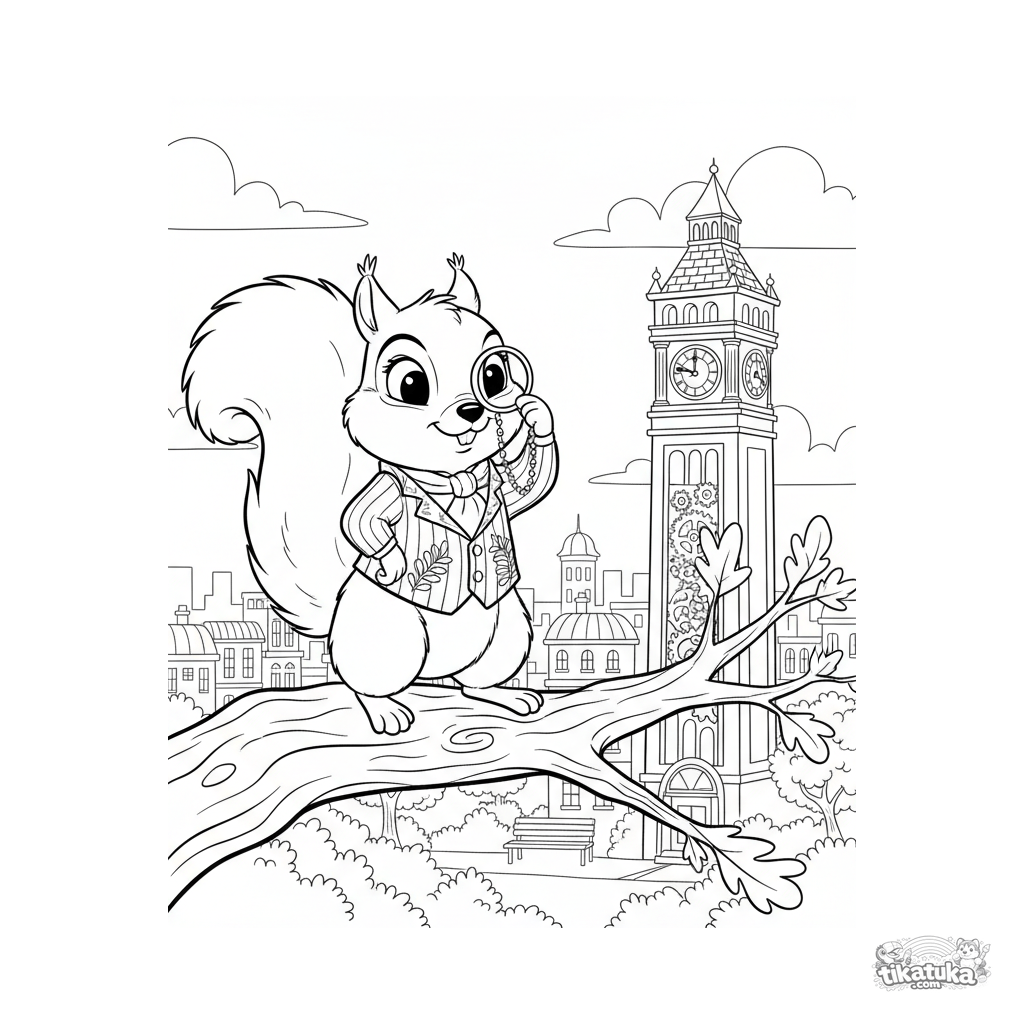 Meme-Stil Ausmalbild: Ein schickes Eichhörnchen mit Weste und Monokel im Baum studiert einen Bankturm. Detaillierte und lustige Szene für 10-12 Jährige.