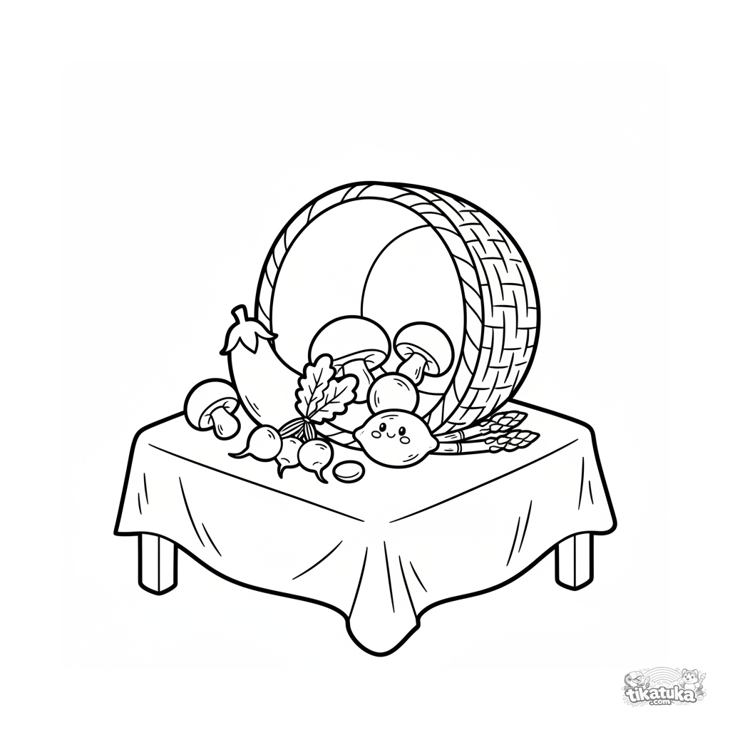 Einfaches Ausmalbild für Kleinkinder 2-3: ein voller Korb mit Gemüse und Obst auf dem Markt. Große erkennbare Formen, dicke Umrisse, Volksdruck-Stil.
