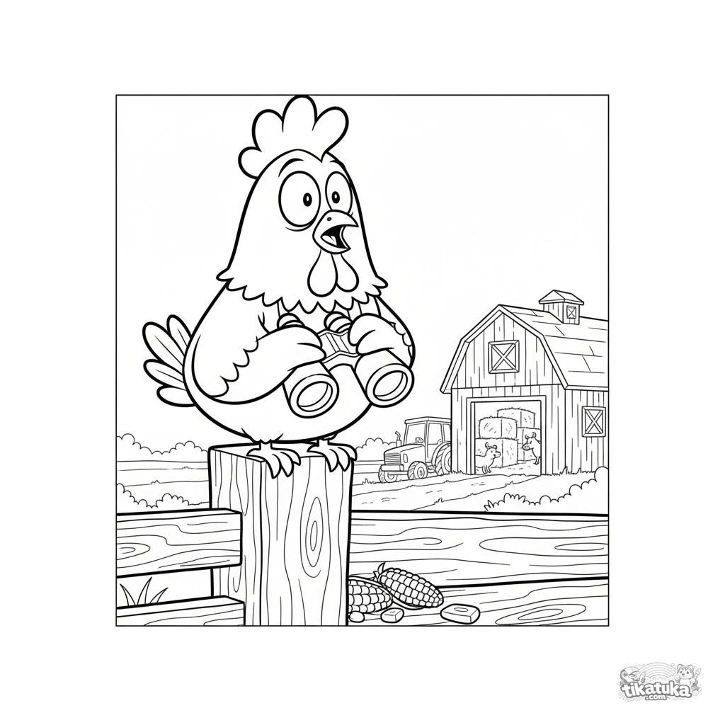 Ausmalbild für Kinder 10-12: ein panisches Huhn auf einem Zaunpfahl schaut mit einem Fernglas auf etwas in der Scheune. Lustiges Meme mit Überreaktion und Details.
