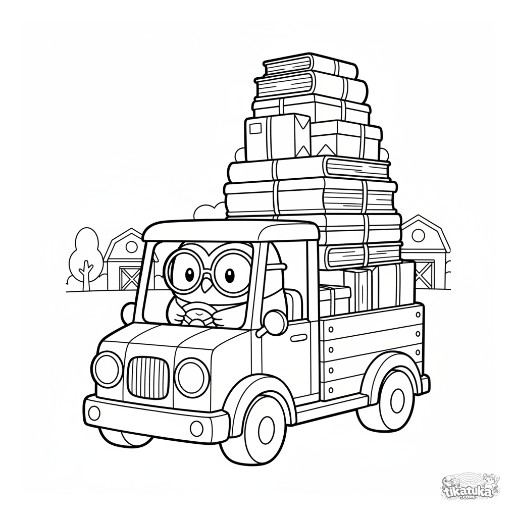 Ausmalbild mit Eule Oof als Fahrer eines Holzliefersattels mit Buchpaketen. Für Jungen von 4-6 Jahren.